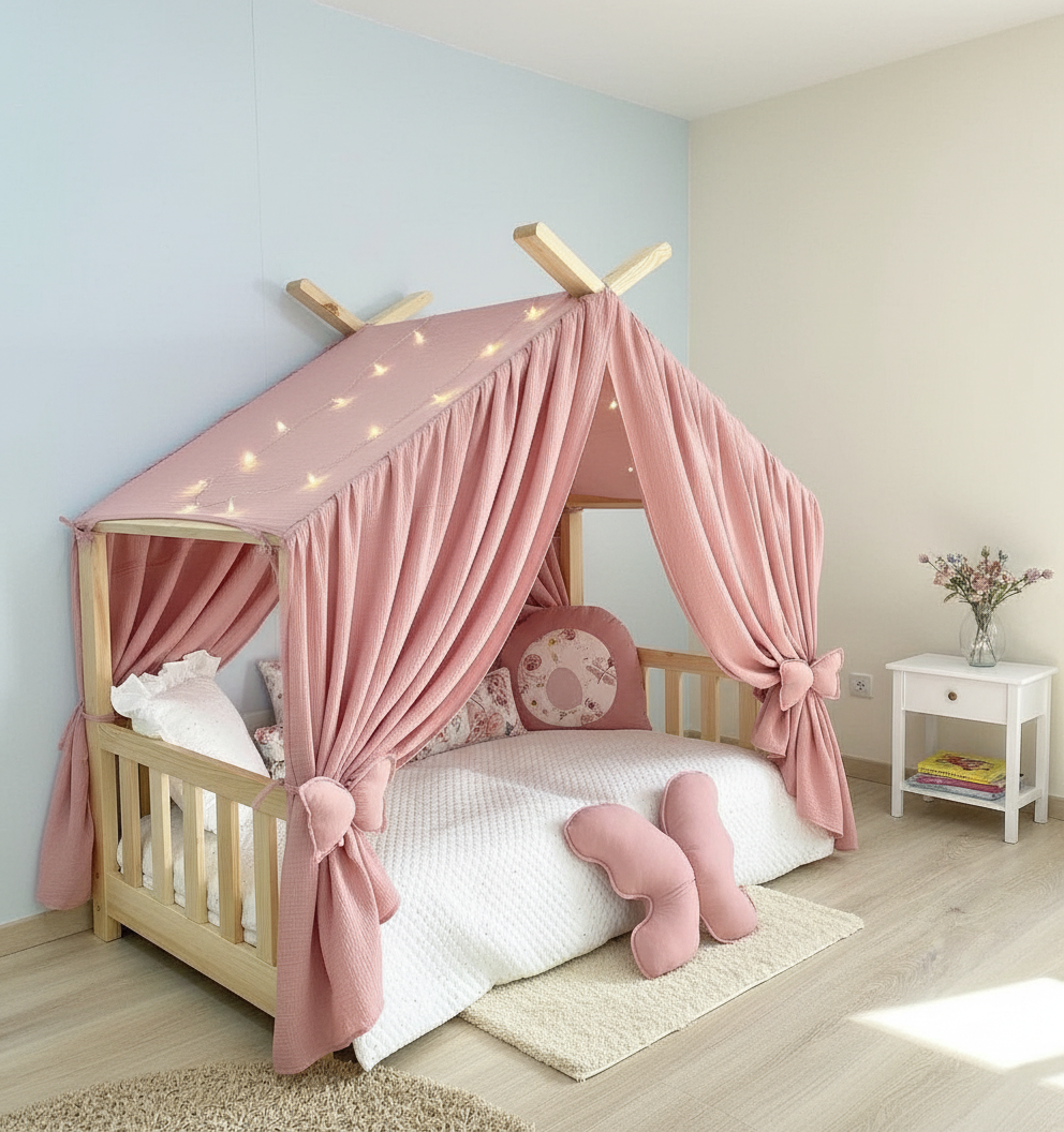 House bed canopiesUnser neutraler Baldachin bringt ruhigen, gemütlichen Charme in jedes Kinderzimmer.